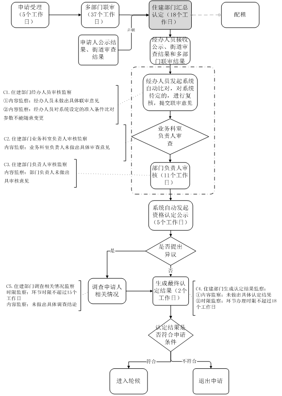 ?。ǘ┒嗖块T聯(lián)審環(huán)節(jié):實行街道(鎮(zhèn))審查,住建、民政及其他有關部門核查并聯(lián)審核機制,辦理時限不得超過37個工作日,其中街道(鎮(zhèn))審查及異議處理時限不得超過20個工作日(含5個公示日)。