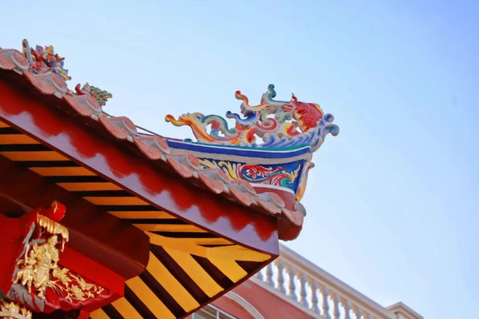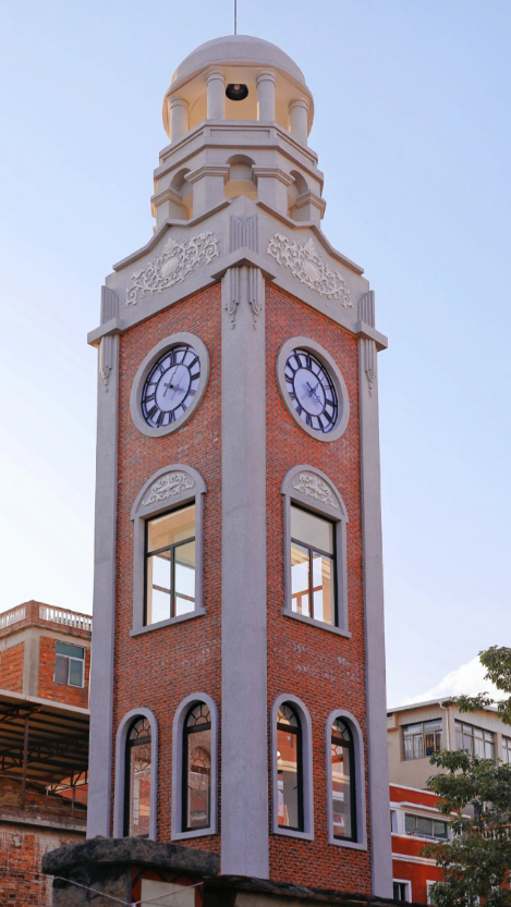 步入街區,一座七層高的塔樓矗立于西側,挺拔而醒目。這座塔樓融合了傳統樓閣的典雅形制與僑鄉文化元素,采用南洋風格鐘樓造型,結構精巧、造型典雅。外立面巧妙運用閩南紅磚與雕花裝飾,細節之處盡顯閩南古韻與南洋風情。塔樓不僅在形態上延續了傳統樓閣之美,更通過細部裝飾承載起深厚的僑鄉記憶,成為連接歷史與當代、鄉土與海外的重要視覺與文化符號。