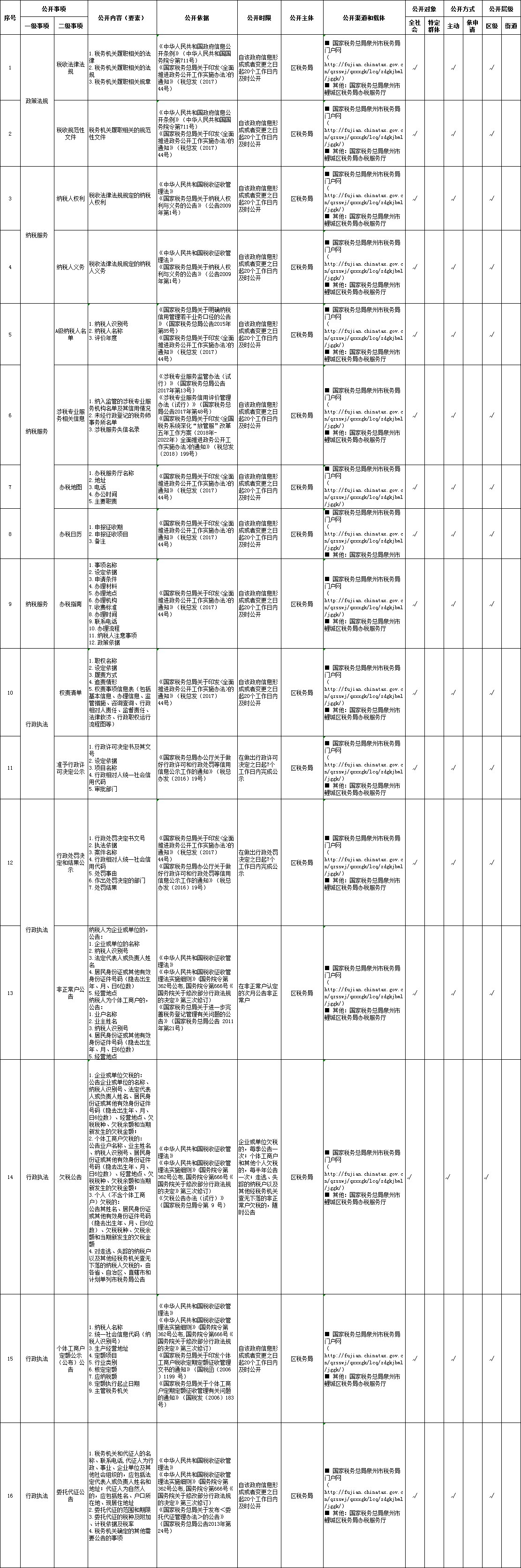 泉州市鯉城區稅收管理領域基層政務公開標準目錄