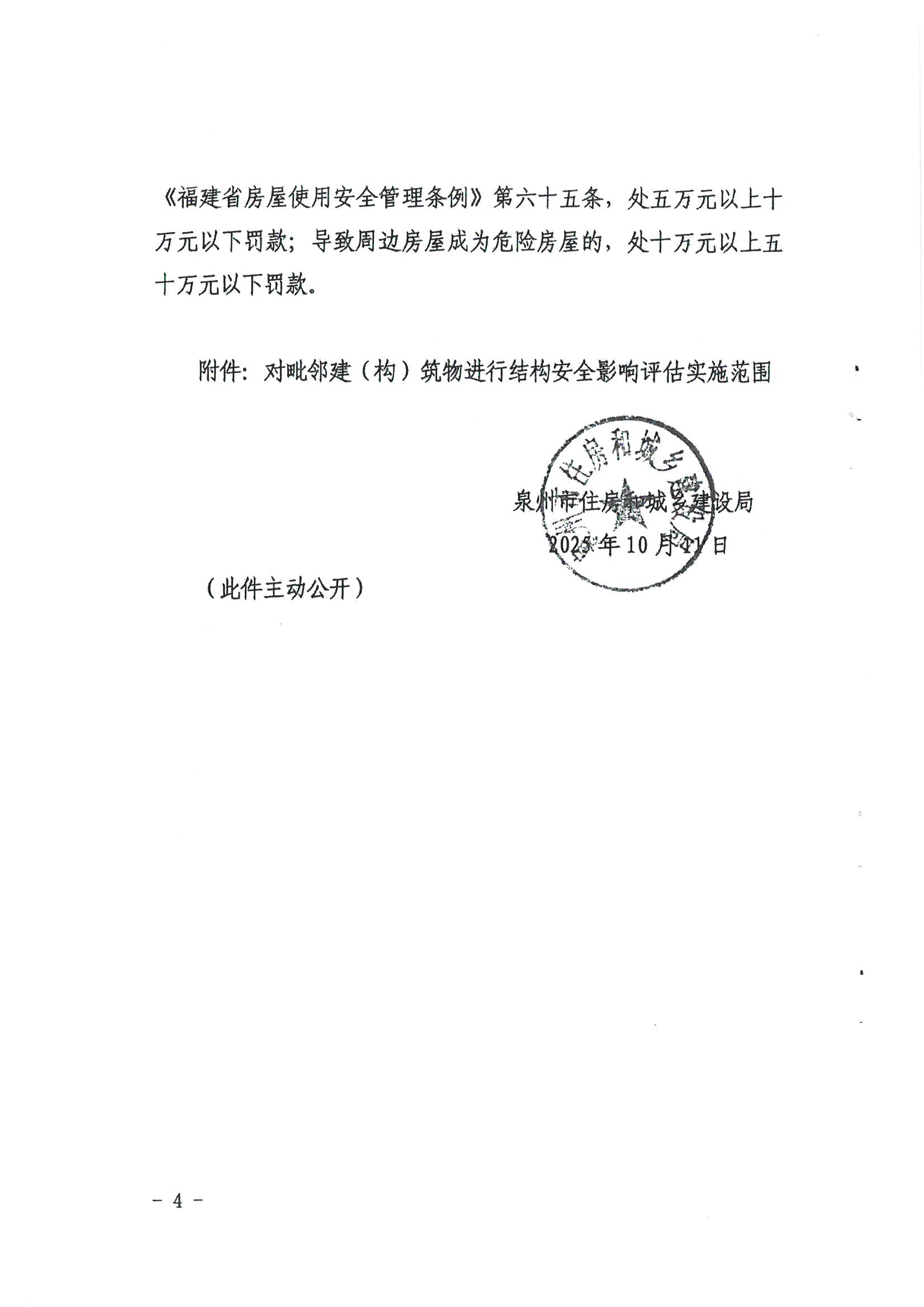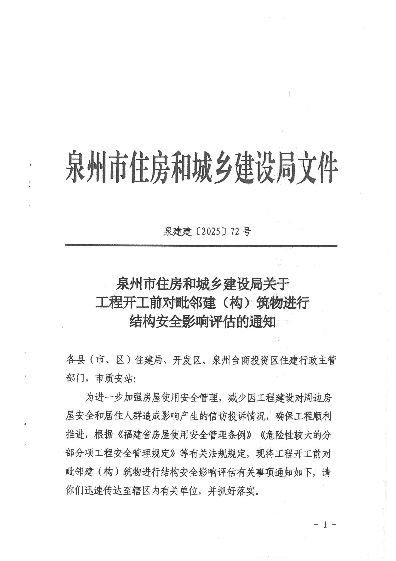 為進一步加強房屋使用安全管理,減少因工程建設對周邊房屋安全和居住人群造成影響產生的信訪投訴情況,確保工程順利推進,現將《泉州市住房和城鄉建設局關于工程開工前對毗鄰建(構)筑物進行結構安全影響評估的通知》(泉建建〔2025〕72號)轉發給你們,請按照文件要求做好落實。
