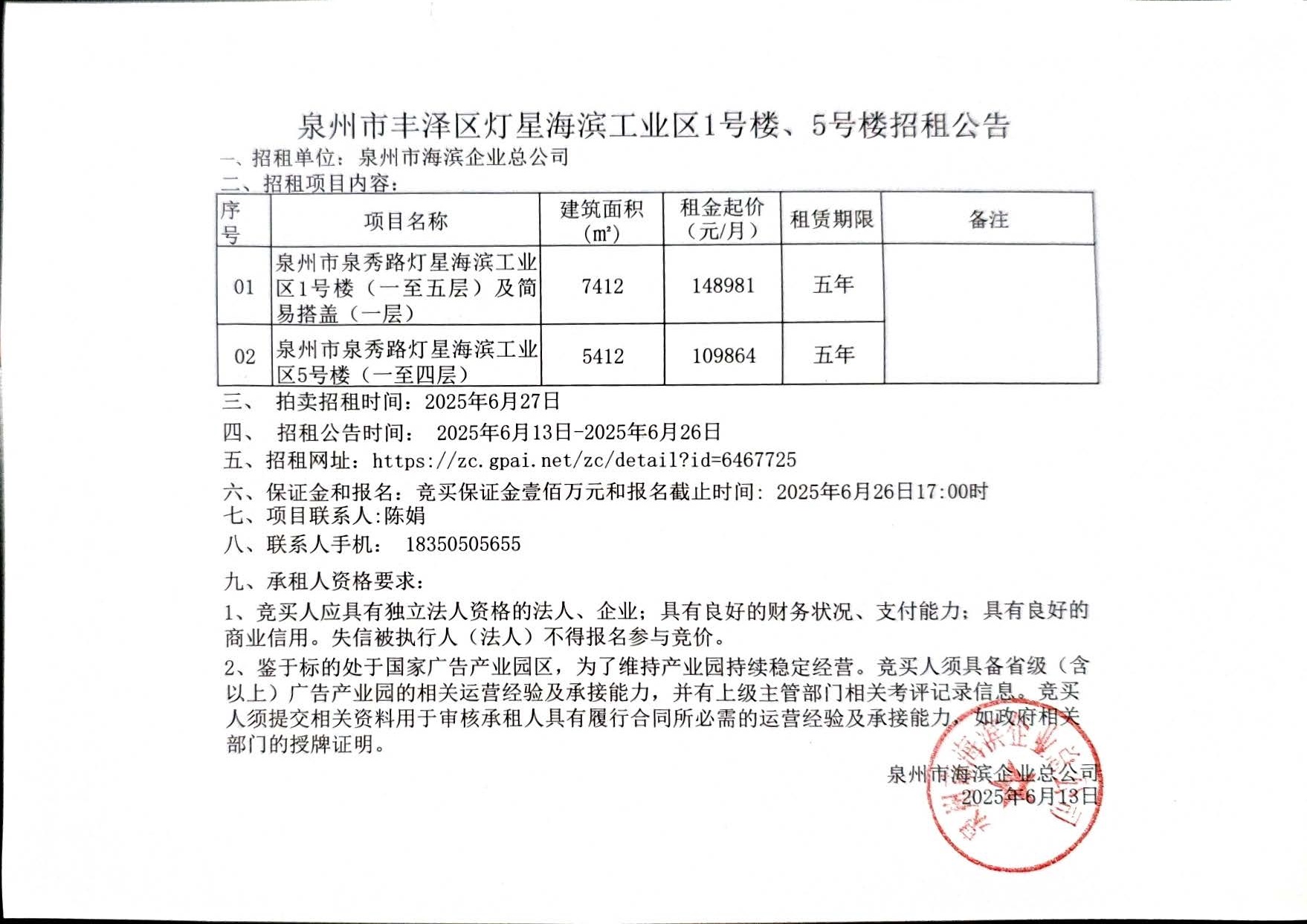 泉州市豐澤區燈星海濱工業區1號樓、5號樓招租公告